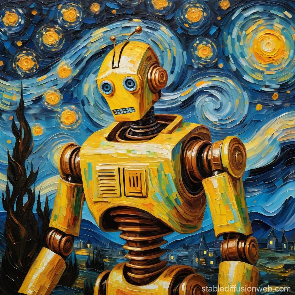 I write a simple prompt that goes like this: “An oil painting in the style of Vincent van Gogh depicting a humanoid robot painting on a canvas under a swirling starry night sky. The scene is rendered with bold and expressive brushstrokes, vibrant and vivid colors, and rich textures, capturing the essence of post-impressionism.”