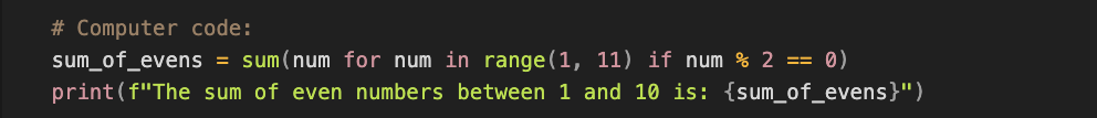 In human language, one might ask you to find the sum of all even numbers between one and ten. If you want to ask a computer the same question, it would look like this in the programming language called Python: